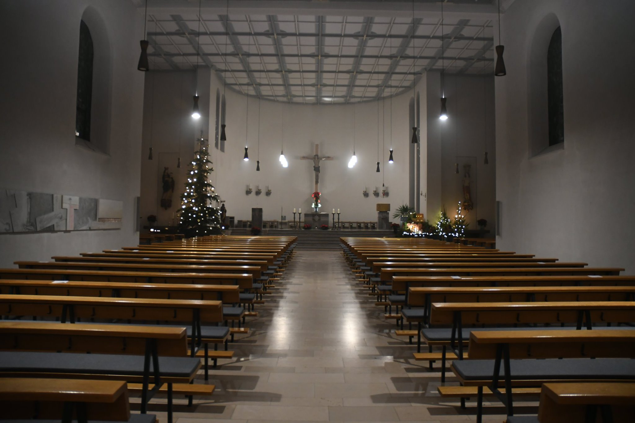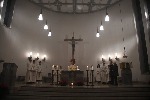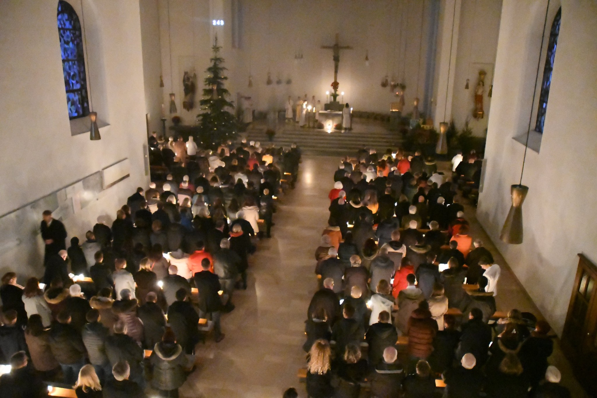 Die Christmette in der Pfarrkirche St. Maria Magdalena in Roxheim zelebrierte Pfarrer Michael Baldauf. Das Friedenslicht aus Bethlehem wurde zu Beginn an die Gläubigen ausgeteilt, 24.12.19