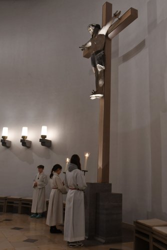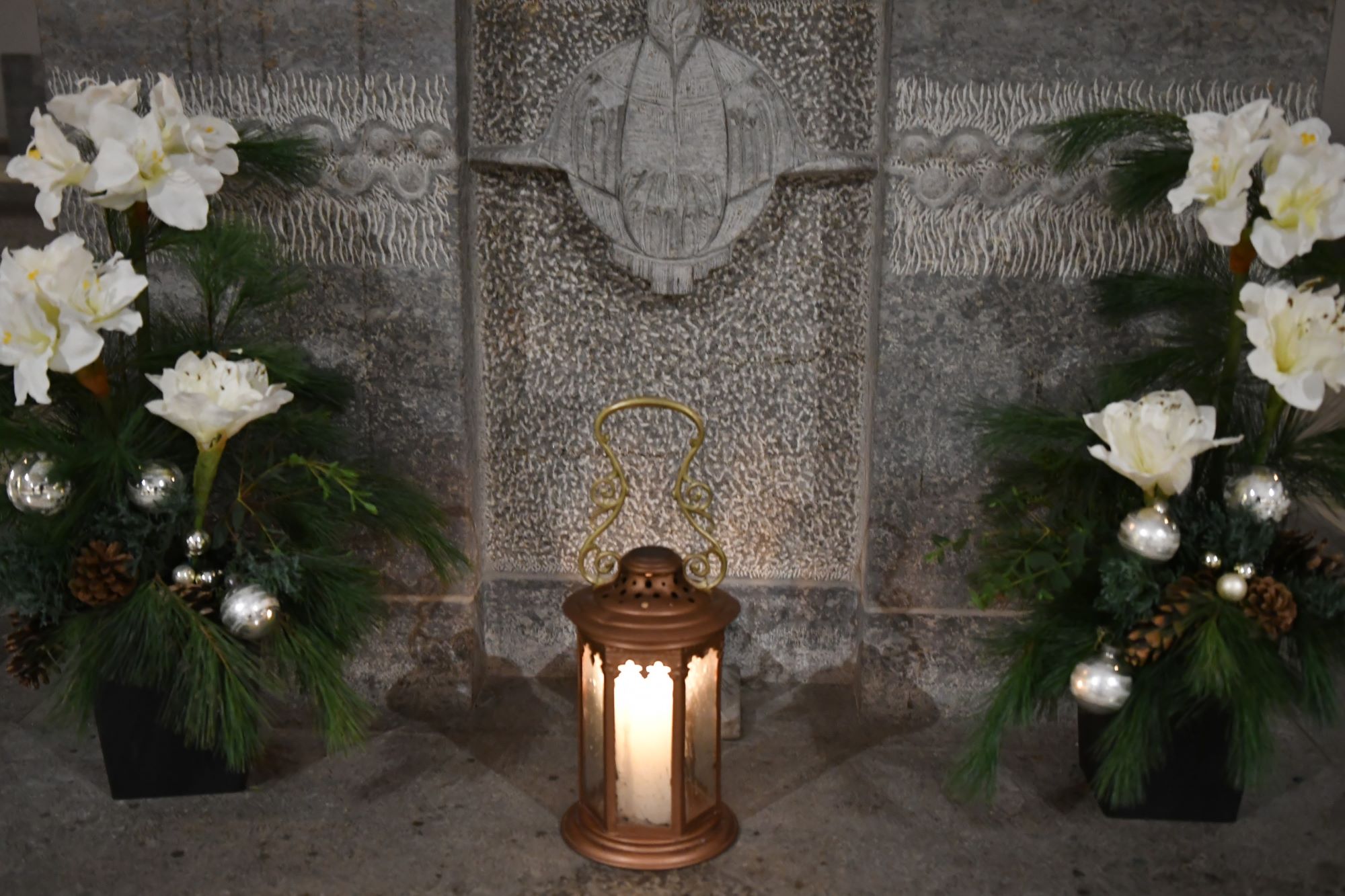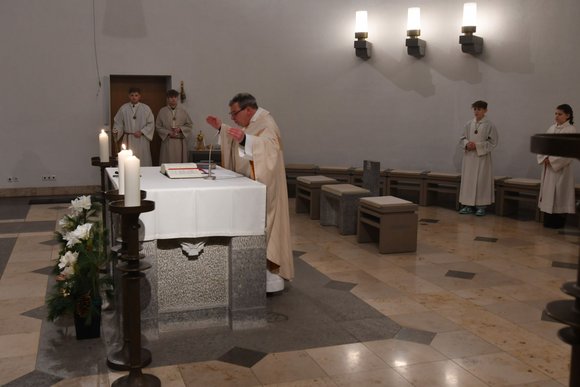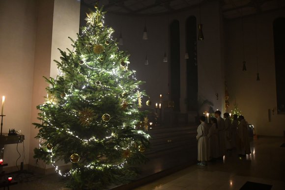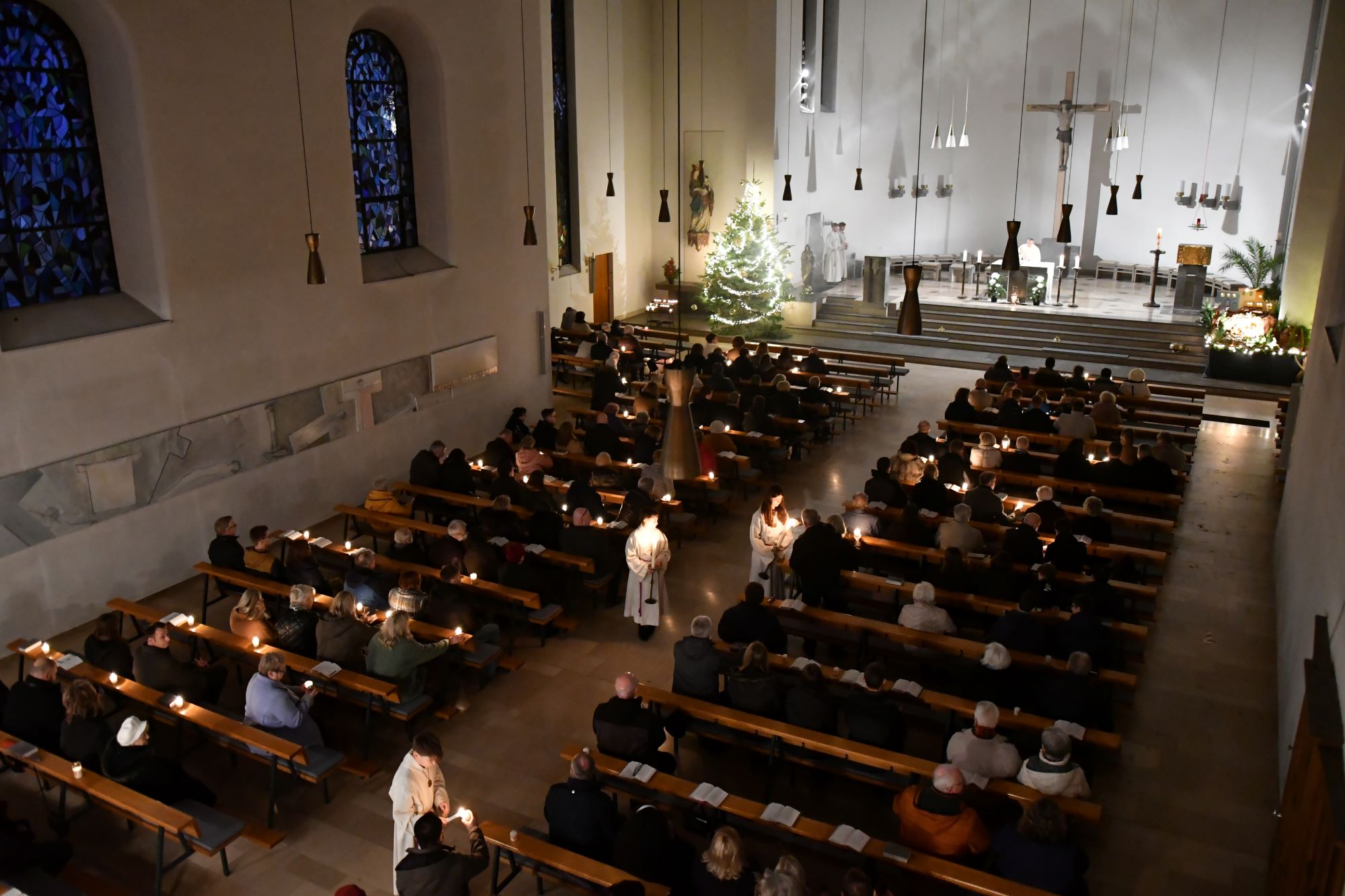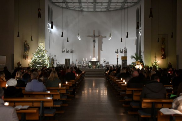 Christmette in der Pfarrkirche St. Maria Magdalena Roxheim, zelebriert von Pfarrer Markus Hary. Das Friedenslicht aus Betlehem wurde ausgeteilt, Heilig Abend, 24.12.2022