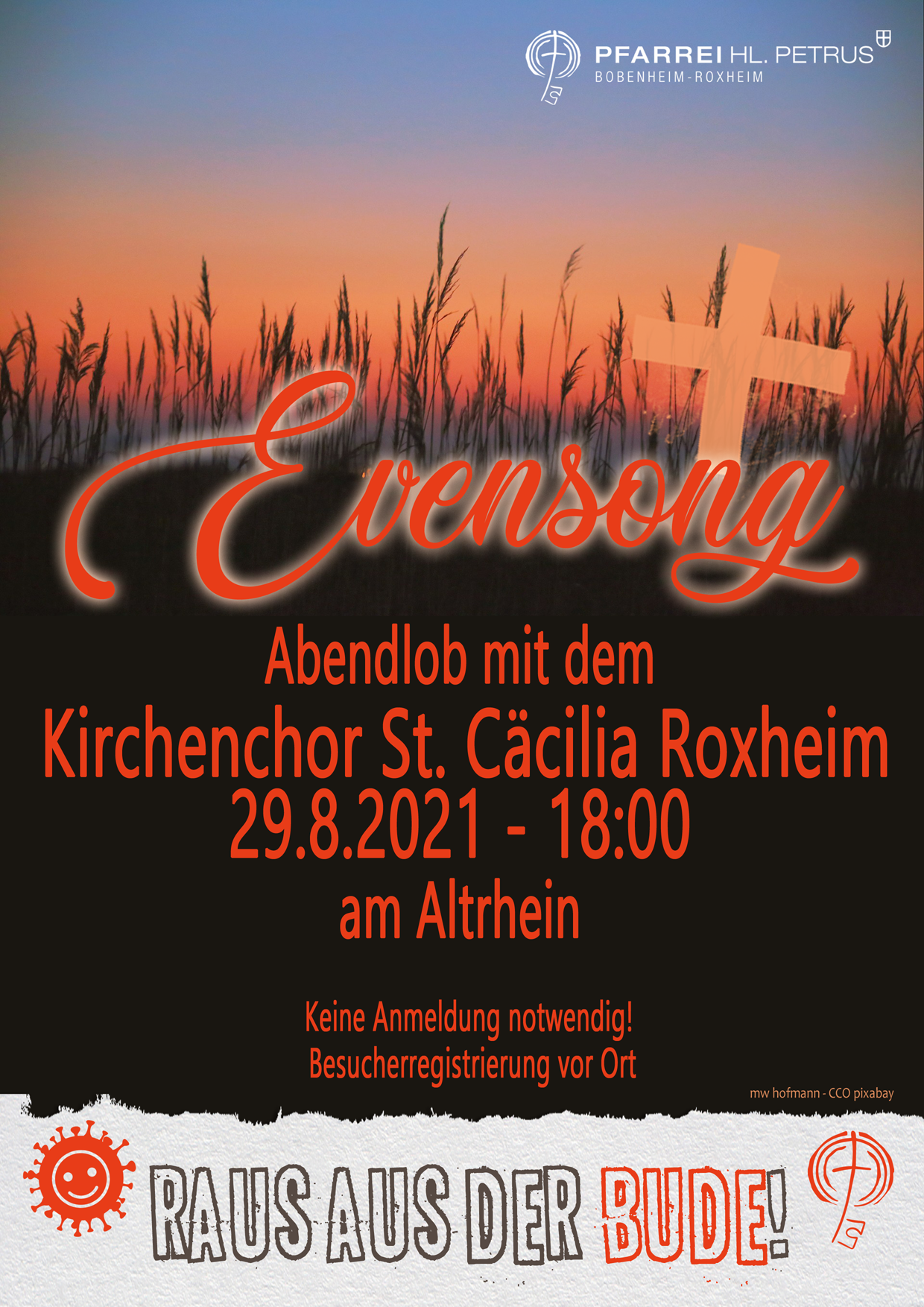 Der Kirchenchor St. Cäcilia Roxheim lädt am 29. August 2021 um 18:00 Uhr zu einem Abendlob am Altrhein in Roxheim, unterhalb des Kriegerdenkmals, ein.