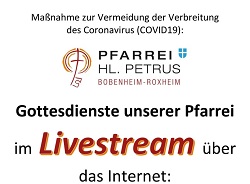 Den Link zum aktuellen Gottesdienst sowie eine Übersicht zu den bisherigen Livestreams finden Sie auf unserem YouTube-Kanal "Pfarrei Hl. Petrus Bobenheim-Roxheim" (keine Anmeldung erforderlich). Sie können den Kanal auch gerne abonnieren, dann werden Sie auf allen Ihren Geräten (auch auf Ihrem Smart-TV) direkt zu Ihren Abos geleitet.