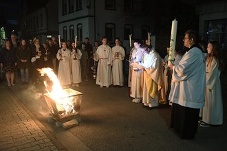 Zu Beginn der Liturgie versammelte sich die Gemeinde im Freien um das lodernde Osterfeuer. In diesem feierlichen Rahmen entzündete Pfarrer Hary die Osterkerze. Nach ihrer Weihe wurde sie in einer feierlichen Prozession in die zunächst dunkle Kirche getragen. Das Licht der Kerze, das sich nach und nach im Kirchenraum ausbreitete, steht sinnbildlich für Christus als das Licht der Welt, das die Dunkelheit überwindet und den Menschen Orientierung und Hoffnung schenkt.