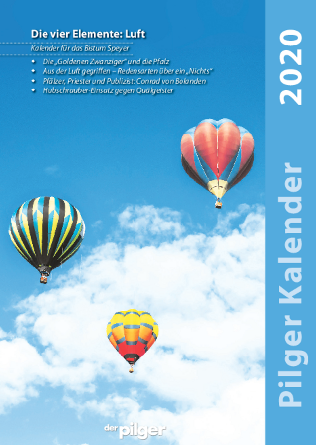 Im Speyerer Peregrinus-Verlag ist der neue Pilger-Kalender für das Jahr 2020 erschienen. Die 146 Seiten starke Publikation enthält nicht nur ein Kalendarium und Daten für das kommende Jahr, sondern auch Wissenswertes, Unterhaltsames und historische Beiträge, die mit der katholischen Kirche in der Pfalz und der Saarpfalz zu tun haben. Schwerpunktthema innerhalb der vierteiligen Reihe „Die vier Elemente“ bildet im Jahr 2020 die „Luft“.
